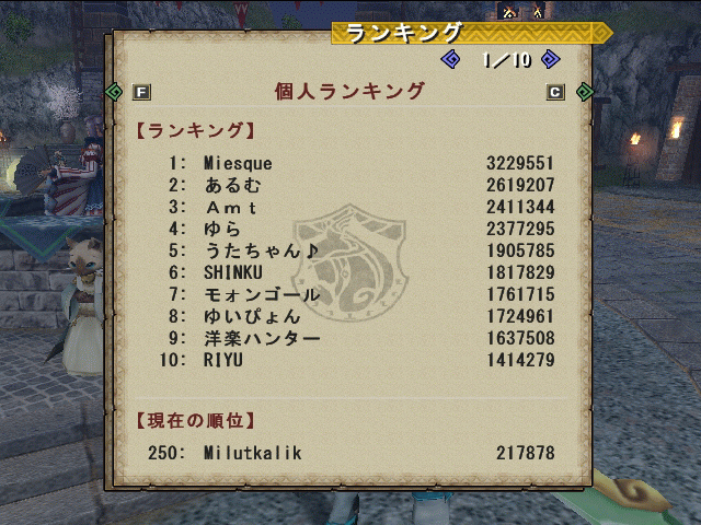 合計で100万を超えたハンターは21人、一方で猟団全体で100万を超えたのが33団であることから、ハンター達の一極集中的な傾向が伺える。僕自身も個人では250位だが、猟団全体では(合計が3倍弱にも関わらず)93位にランクインできている。